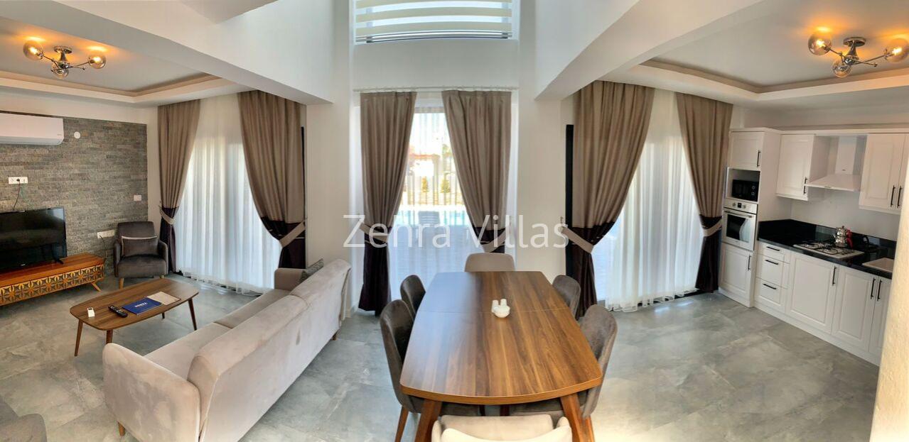 Detayları : Oturma grubu,LCD TV, Klima, 6 kişilik yemek masası, Şömine,havuz terasına geçiş ve WC/Lavabo bulunmaktadır