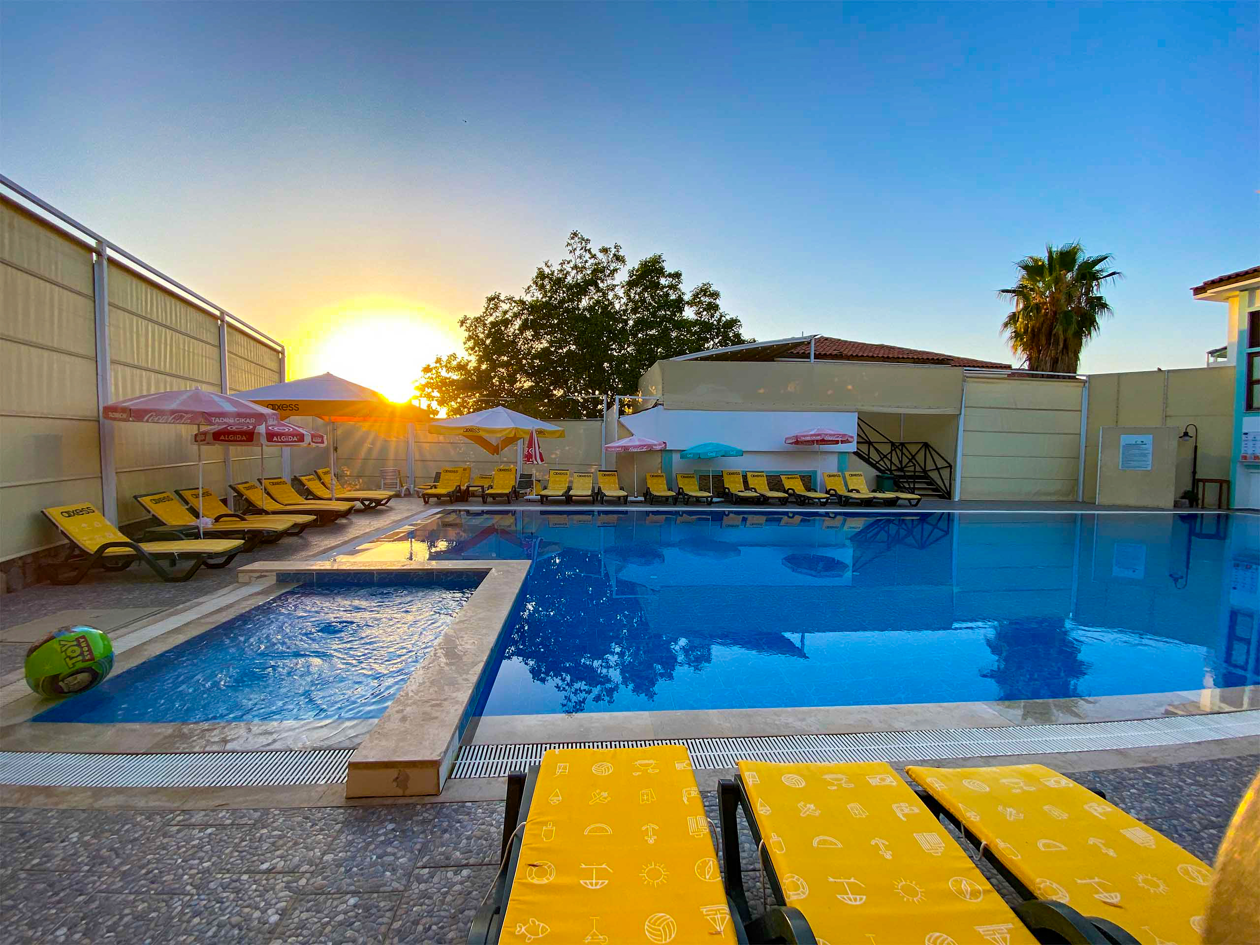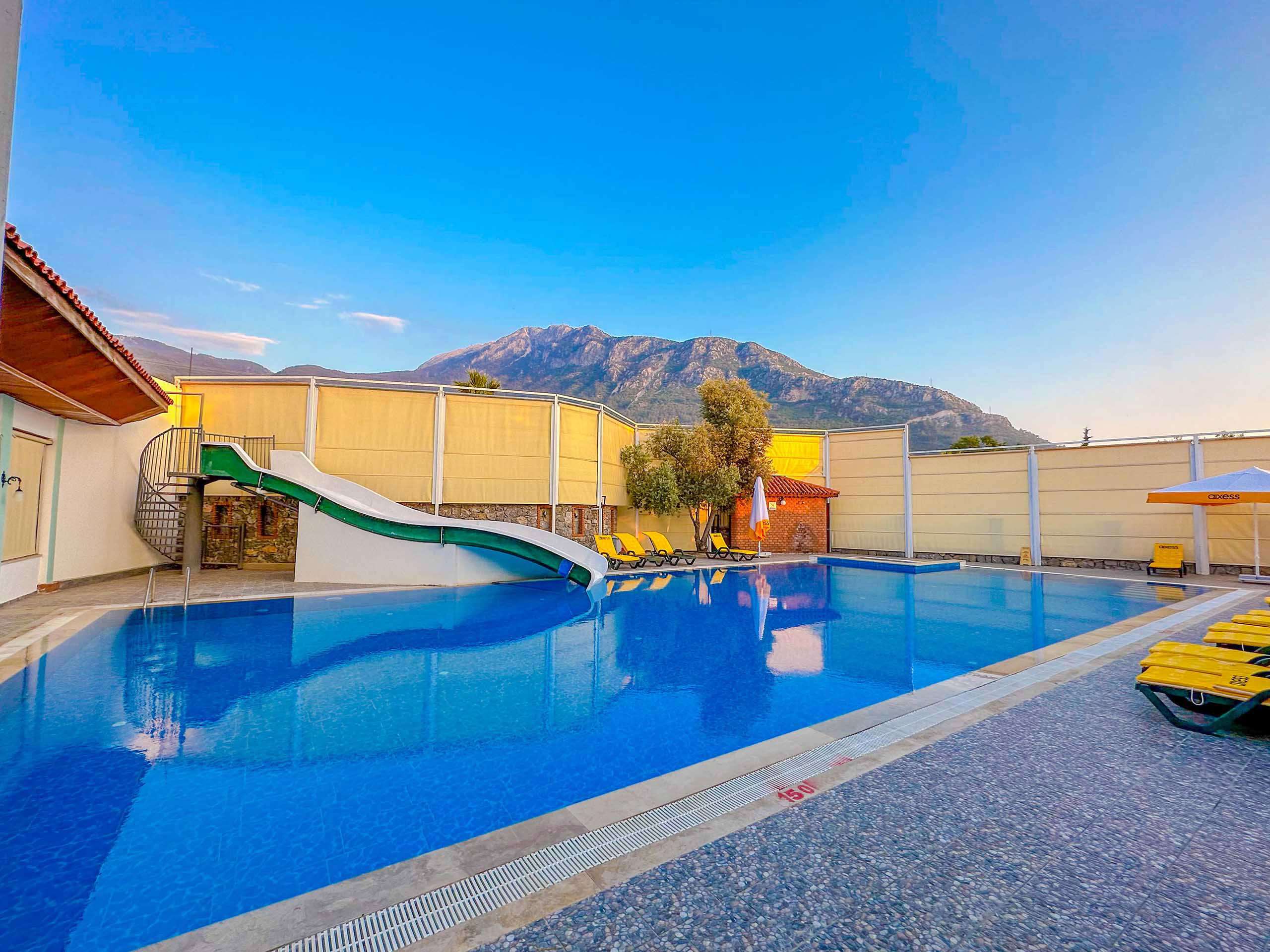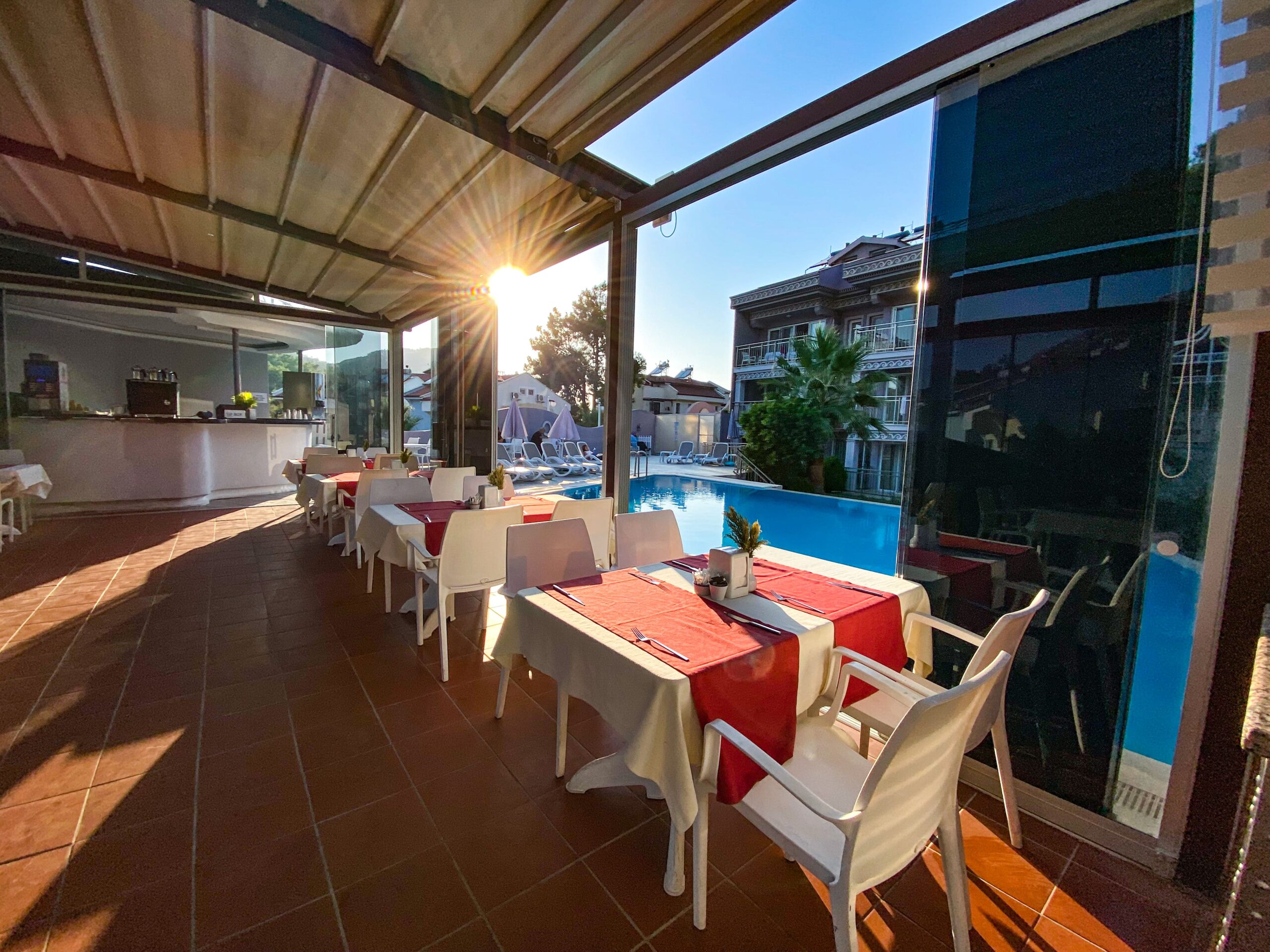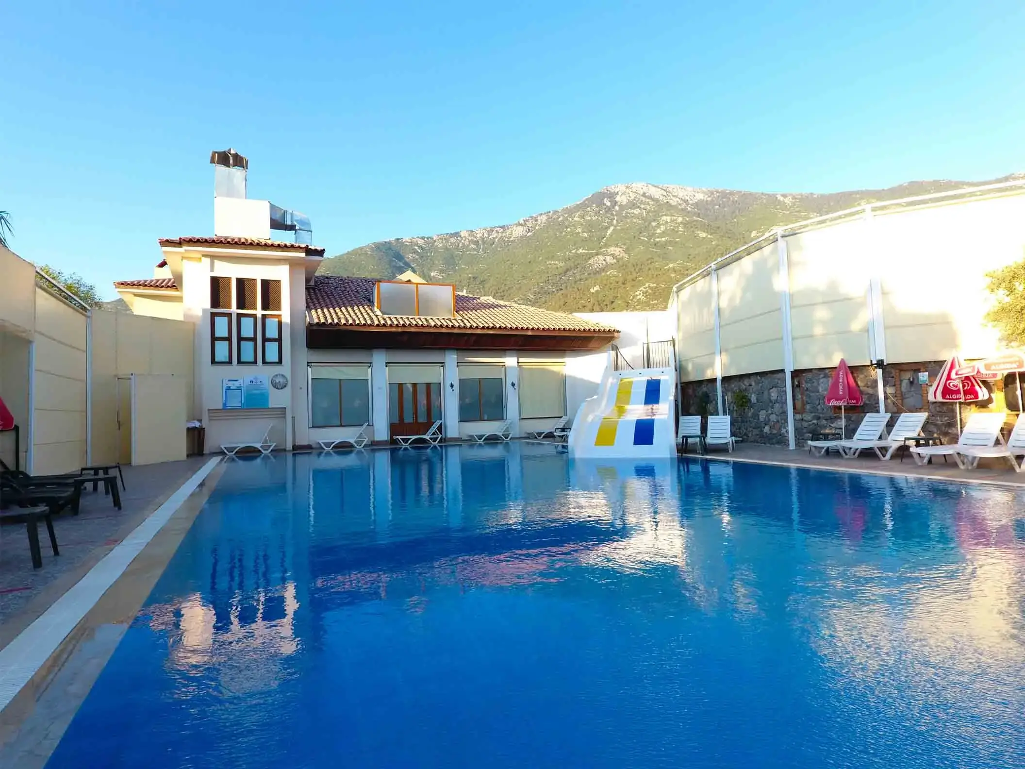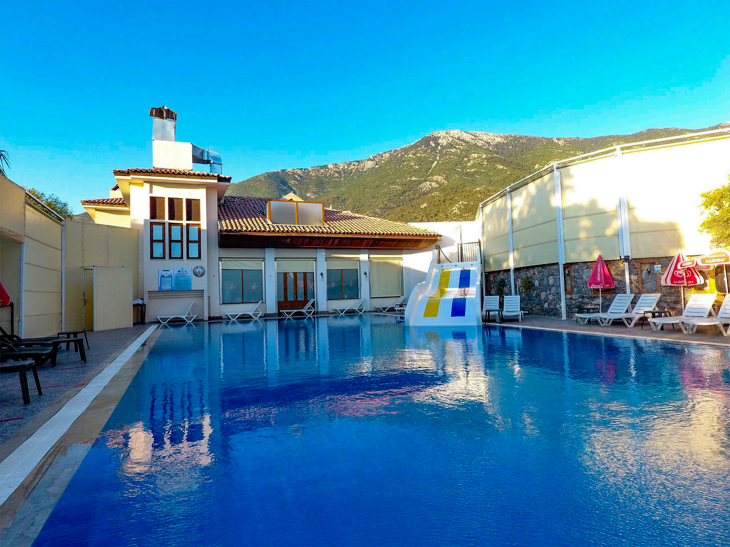 Fethiye de muhafazakar villa konseptinde lüks korunaklı havuzlu villa tatilini otel imkanları ile birleştirdi. Açık büfe Sabah kahvaltısı ve Açık Büfe Akşam yemeği bunun yanında Plaja giden Misafirlerimize öğle yemeği SET MENÜ şeklinde işletmemizin ikramı olarak verilmektedir. Türkiye de ilk olarak bayanlara özel plaj hizmeti ile Türkiye’de muhafazakar villa konseptinde bir çok ilki gerçekleştirmiştir.