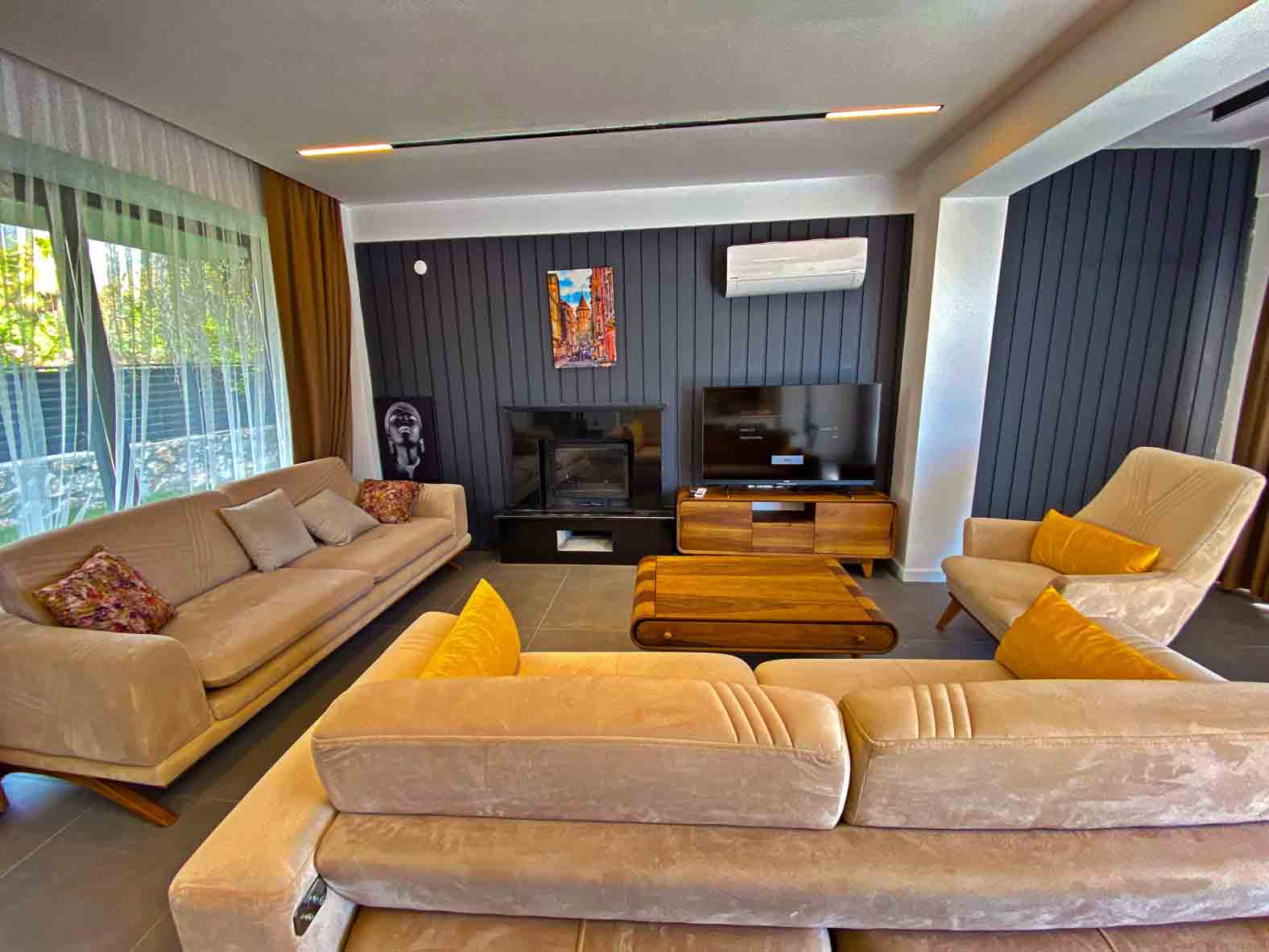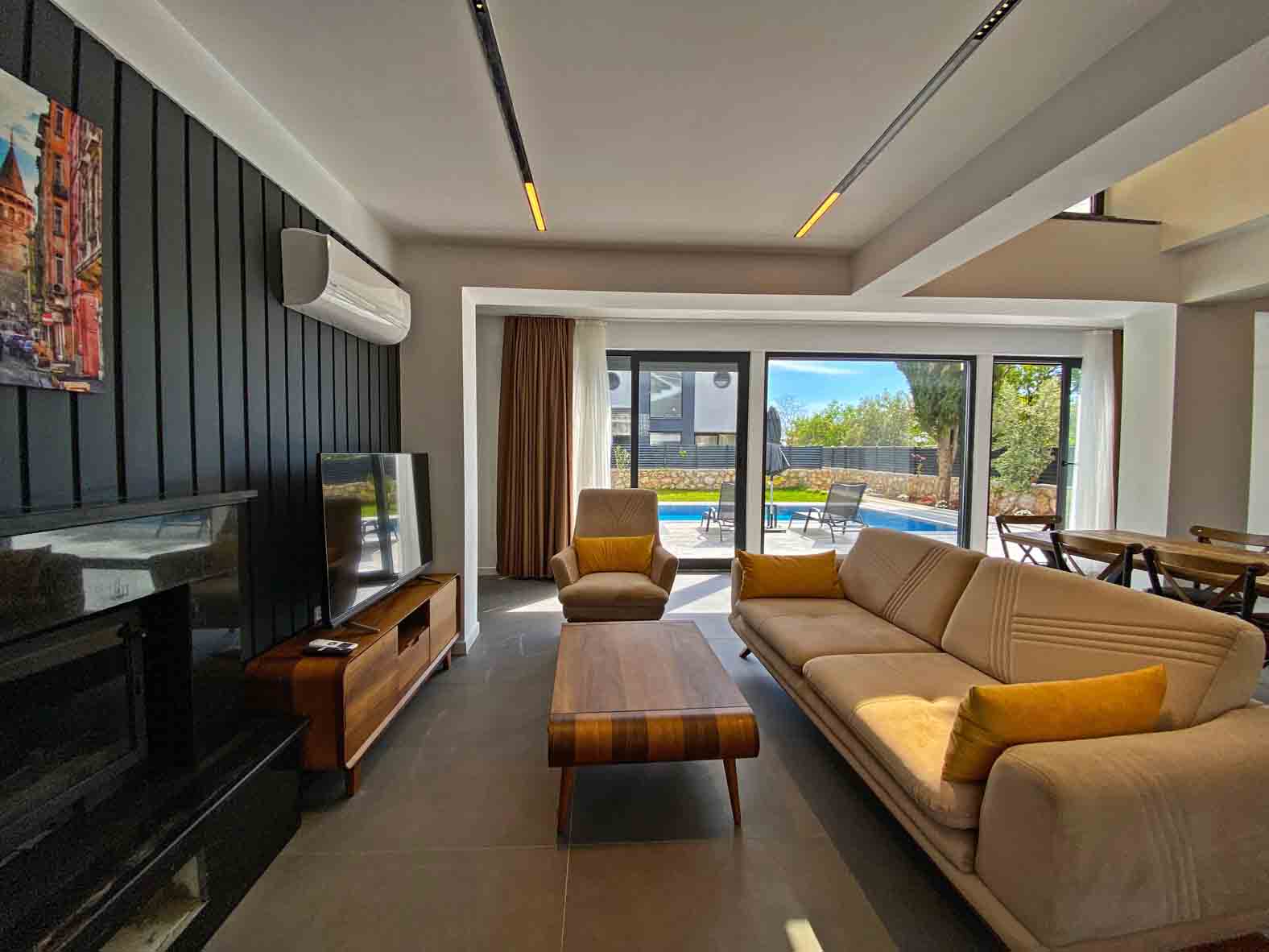 Detayları: Oturma grubu,LCD TV, Klima, 6 kişilik yemek masası, Şömine,havuz terasına geçiş ve WC/Lavabo bulunmaktadır
