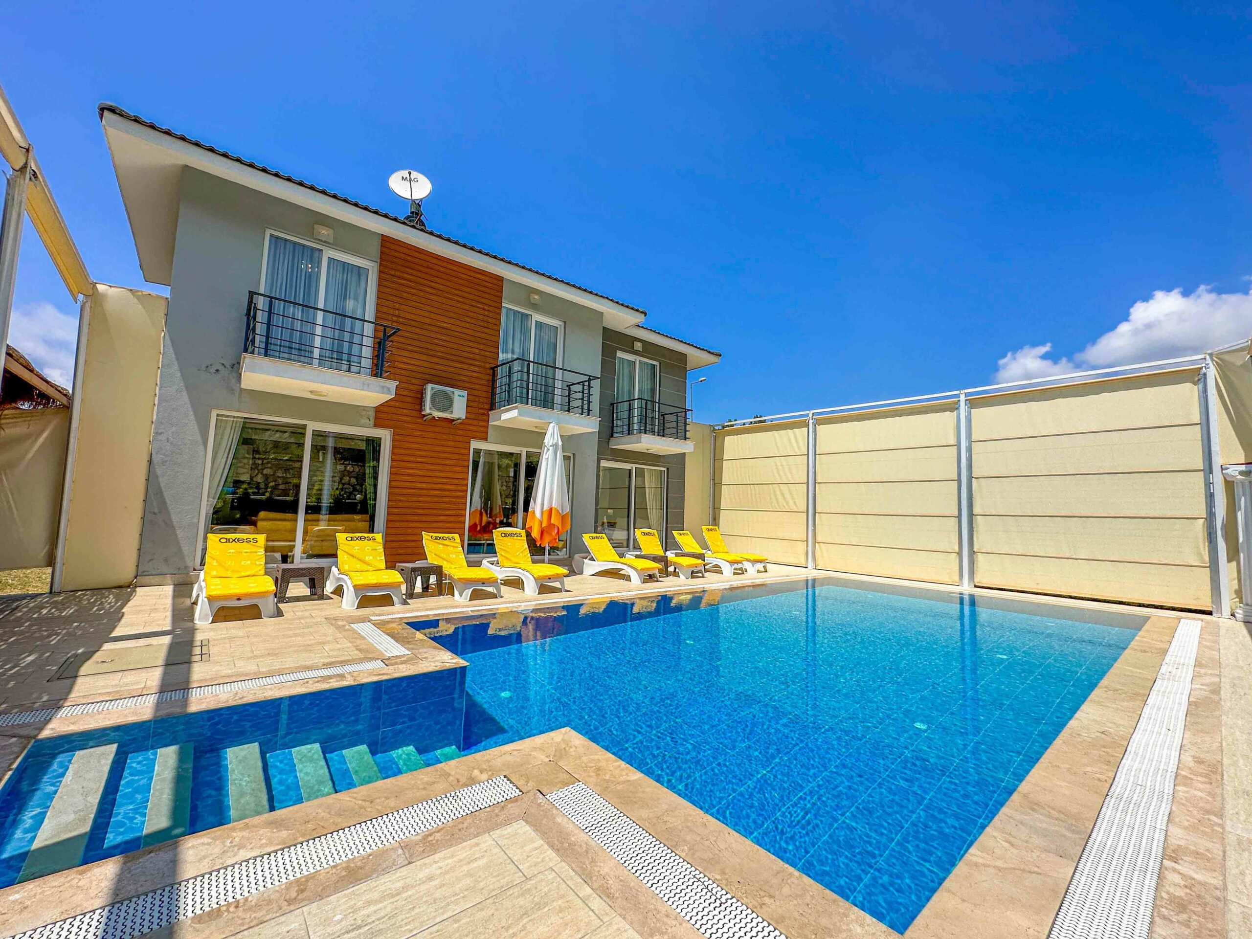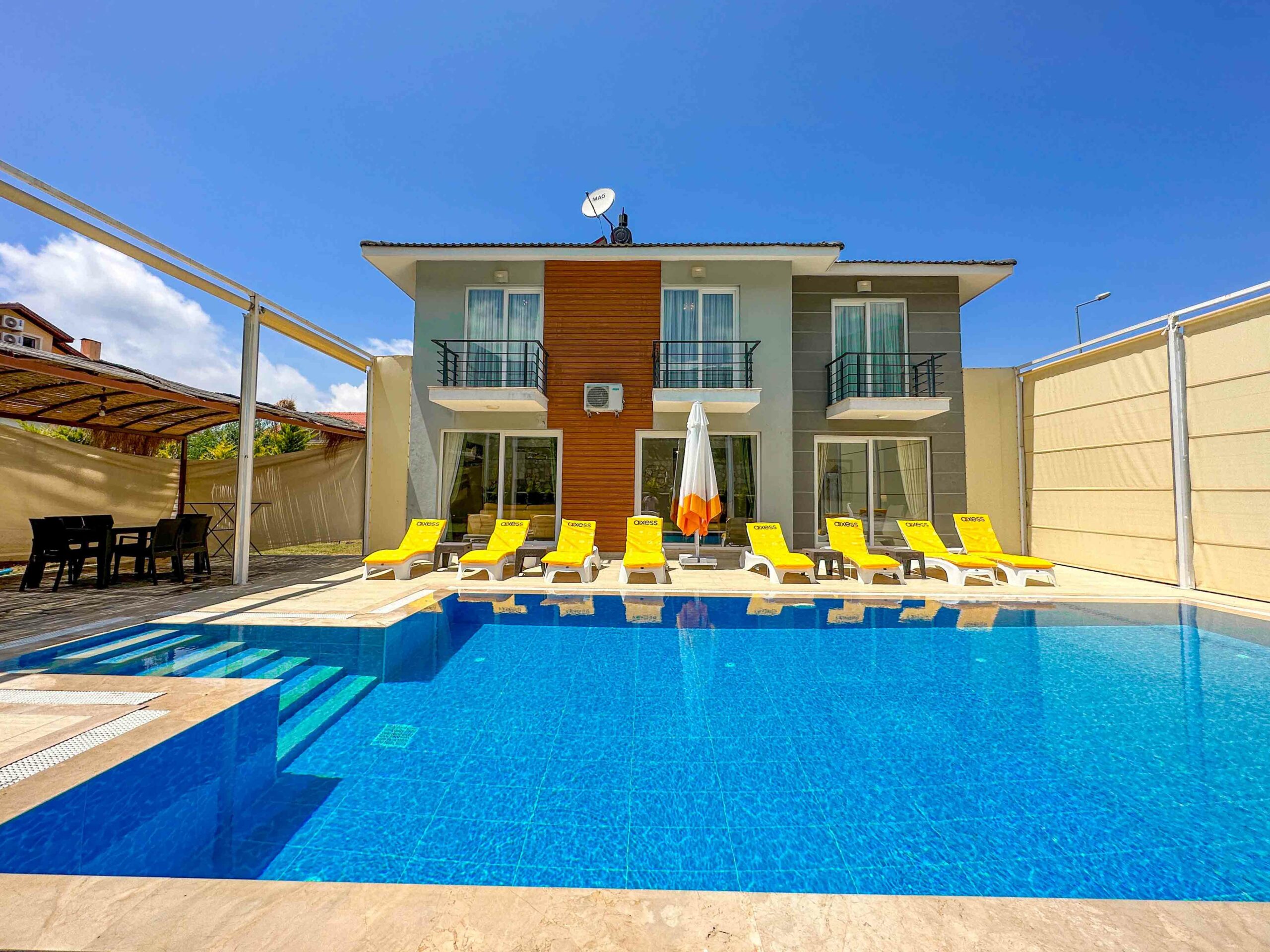 Oldukça geniş ve yeşil bir bahçe içerisinde özel havuz, havuz başı duş, 8 adet şezlong, yeteri kadar şemsiye, yemek masası ve sandalyeler bulunmaktadır.